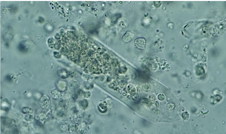 Figure 2: Leukocytic cast (light microscope, x 400 own file)