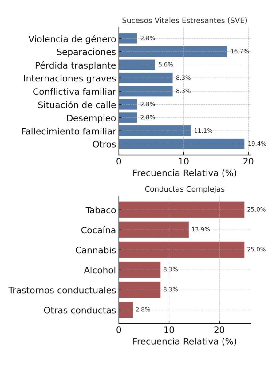 De las variables psicosociales evaluadas destacamos que más de la mitad de los sujetos presentaron al menos un suceso vital estresante significativo en el último año (52,8%) siendo el más frecuente, separaciones (16,7%), fallecimiento de un familiar (11,1%), internaciones graves (8,3%) o conflictivo familiar (8,3%). A su vez, casi la mitad de los sujetos habían presentado al menos una conducta compleja (47,2%), entre las que se destacan tabaquismo (25%), consumo problemático de cannabis (25%) y de cocaína (13,9%) (Gráfico 2).