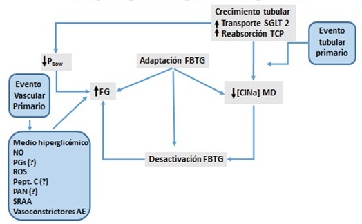La teoría túbulo-céntrica fue postulada pocos años atrás como un modo de explicar el fenómeno de HF a través de procesos que normalmente ocurren en los procesos reabsortivos del TCP y que disparan los mecanismos del FBTG.(165,213,216-217) Según estos postulados, el alto nivel de glucosa presente en el ultrafiltrado glomerular estimula la actividad del SGLT2 del TCP, reduciendo la llegada de solutos a la mácula densa, lo que provoca la desactivación del FBTG y la consiguiente dilatación del AA, con mayor FG y el restablecimiento del nivel de solutos al nefrón distal.(7) Mecanismos similares se han propuesto para la HF observada en pacientes obesos.(31)