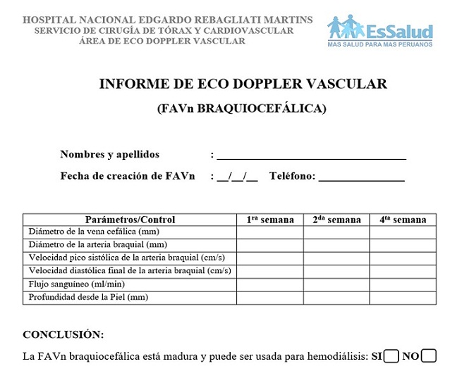 En Perú, fundamentalmente en el Área de EDV del Servicio de Cirugía de Tórax y Cardiovascular del Hospital Nacional Edgardo Rebagliati Martins, se está desarrollando, desde hace tiempo, el control egular ultrasonográfico de las FAVn recientemente creadas. Dichas evaluaciones están basadas en parámetros propuestos por Guo-Cun H y Ferring et al. que incluyen al diámetro vascular (mm), velocidad pico sistólica (cm/s), velocidad diastólica final (cm/s), flujo  sanguíneo (ml/min) y la profundidad desde la piel (mm); realizadas a la primera (1ra), segunda (2da) y cuarta (4ta) semana desde su creación, permitiendo así, la detección temprana de posibles complicaciones y un abordaje terapéutico oportuno de las mismas.(3,10) (Imagen 1)