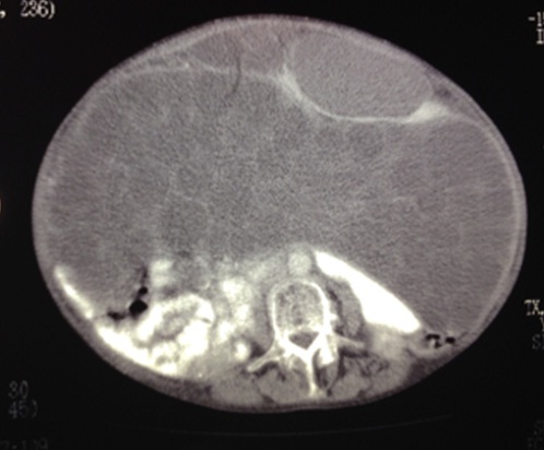Imagen 1. Se aprecia  desplazamiento de asas intestinales y ambos riñones en sentido dorsal