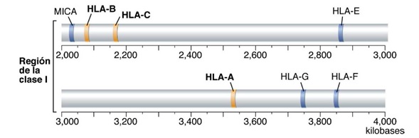 En los seres humanos, el CMH se localiza en el brazo corto del cromosoma 6 y ocupa un gran segmento de ADN, que se extienden unas 3500 kilobases. Existen tres genes de la clase I del CMH denominados HLA-A, HLA-B, HLA-C que codifican tres tipos de moléculas del HLA con los mismos nombres, y existen tres loci de la clase II del CMH denominados HLA-DP, HLA-DQ, HLA-DR, los cuales son considerados como clásicos, sin embargo, existen otros no clásicos a los cuales no me referiré. Cada molécula de la clase II del complejo esta compuesta por un heterodímero de polipéptidos a y b y cada locus del DP, DQ y DR contiene genes separados designados A o B, que codifican las cadenas a y b respectivamente en cada copia del cromosoma 6.