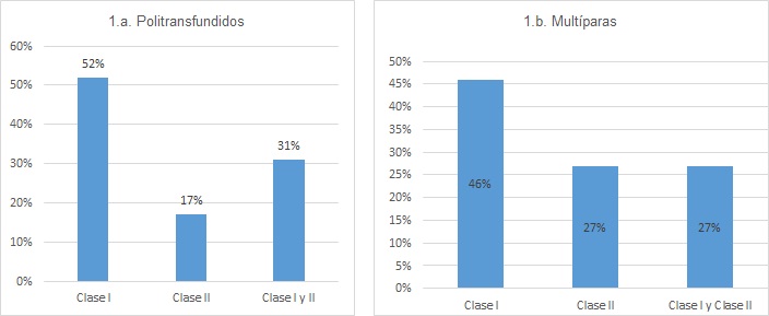 Politrasfundidos N=29 (Clase I: 15, 52%; Clase II: 5, 17%; Clase I y III: 9, 31%). Multiparas N=11 (Clase I: 5, 46%; Clase II 3, 27%; Clase I y II: 3, 27%)