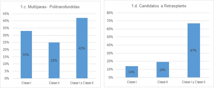 Poli y Multi N=12 (Clase I: 4, 14%; Clase II: 3, 25%; Clase I y II: 5, 47%). Retrasplante N=21 (Clase I: 3, 14%; Clase II: 4, 19%; Clase I y II: 14, 67%)