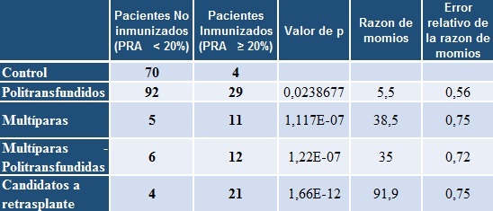 Todos los datos recolectados (sexo, transfusiones recibidas, embarazos, trasplantes previos) y los resultados obtenidos de los ELISA fueron introducidos en una planilla Excel (Microsoft Office, 2013) y luego analizados utilizando herramientas de estadística descriptiva. Para evaluar la asociación entre las variables y la sensibilización contra antígenos de HLA se utilizaron tablas de contingencia de dos por dos, test de chi cuadrado y razón de momios (odd radio). La razón de momios se calculó para cada factor de sensibilización aislado o combinado en http://www.samiuc.es/index.php/estadisticas-con-variables-binarias/medidas-de-comparacion/odds-ratio-or.html. Para todas las pruebas de hipótesis se fijó un nivel de significación de p < 0,05.